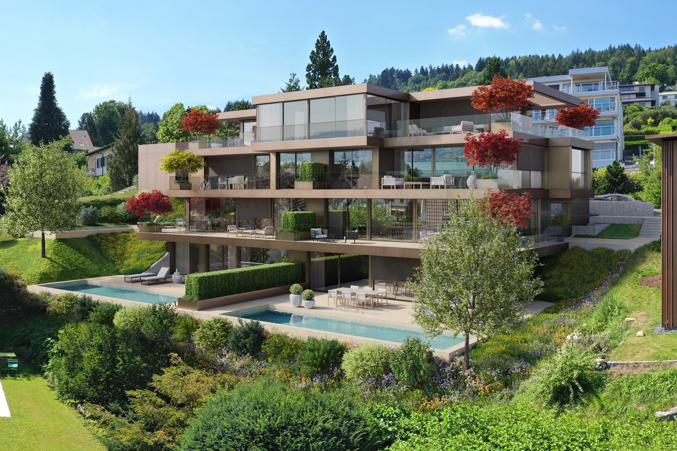 In erhöhter Lage von Horgen mit Blick auf den Zürichsee entstehen sieben luxuriöse Eigentumswohnungen mit hochwertiger Architektur, grosszügigen Grundrissen und modernem Ausbaustandard. Die lichtdurchfluteten Apartments bieten mit Panoramafenstern, grosszügigen Terrassen und privaten Gärten exklusives Wohnen in einer der besten Lagen der Schweiz.